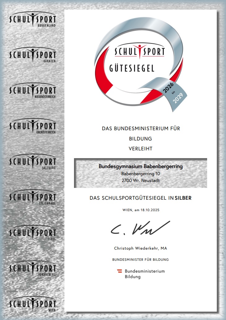 Das Schulsport-Gütesiegel wird vom Bundesministerium für Bildung an Schulen vergeben, die besondere Qualitätsstandards im Unterricht, in der Ausstattung sowie im außerschulischen Sportangebot erfüllen. Die Auszeichnung in Silber zeigt, dass das Bundesgymnasium Babenbergerring in zahlreichen Bereichen des schulischen Sportgeschehens Vorreiter ist.