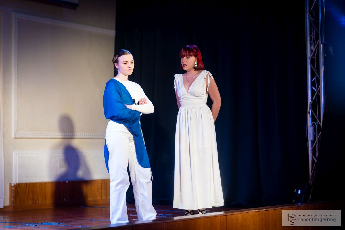 Diese Inszenierung wurde vollständig von Schüler*innen umgesetzt und beeindruckte durch ihre herausragende Qualität: sorgfältig gestaltete Requisiten, ein feines Bühnenbild, starke Texte mit Anklängen an die griechischen Tragödien und Chorlieder, die die Zuschauerinnen zum Nachdenken brachten. Die Aufführung verband auf beeindruckende Weise Tragik und Humor und regte auf direkte und indirekte Weise dazu an, über die moralischen und erzählerischen Entscheidungen zu reflektieren.