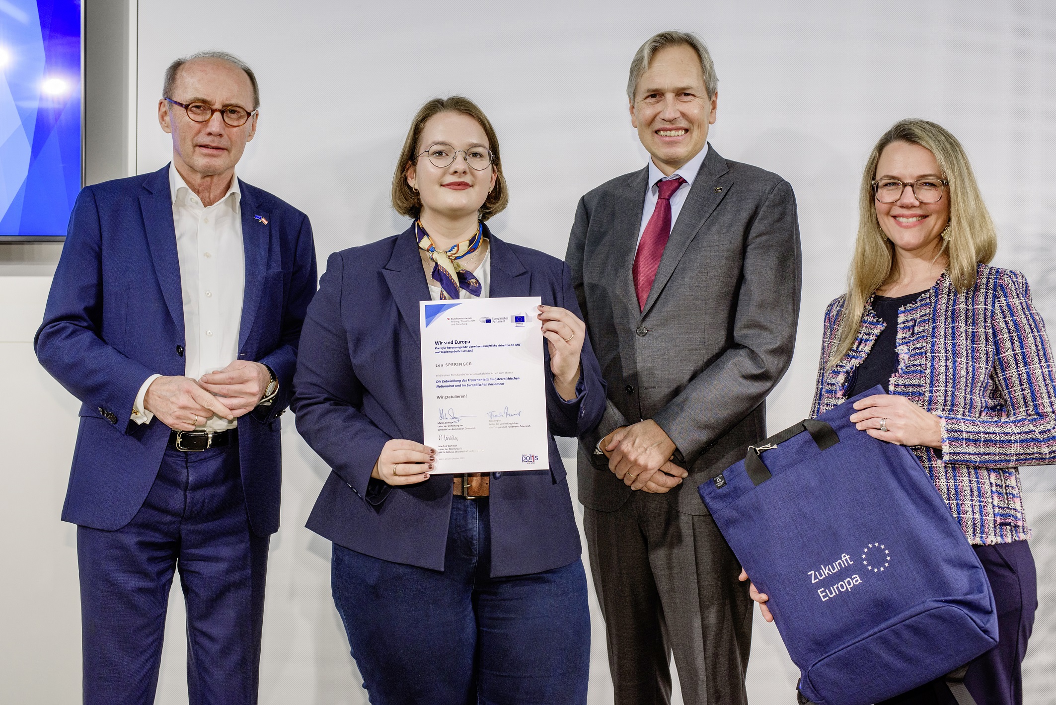 Die von Lea Speringer verfasste Vorwissenschaftliche Arbeit zum Thema "Die Entwicklung des Frauenanteils im österreichischen Nationalrat und im Europäischen Parlament" wurde von der Vertretung der Europäischen Kommission in Österreich mit dem Preis "Wir sind Europa" für herausragende vorwissenschaftliche Arbeiten im Themenfeld "Europa/Europäische Union" ausgezeichnet. Am 20. Oktober 2023 wurde der Preis vom ersten Vizepräsidenten des Europäischen Parlaments, Dr. Othmar Karas, persönlich im Haus der Europäischen Union in Wien überreicht. Das BG Babenbergerring gratuliert herzlich!
